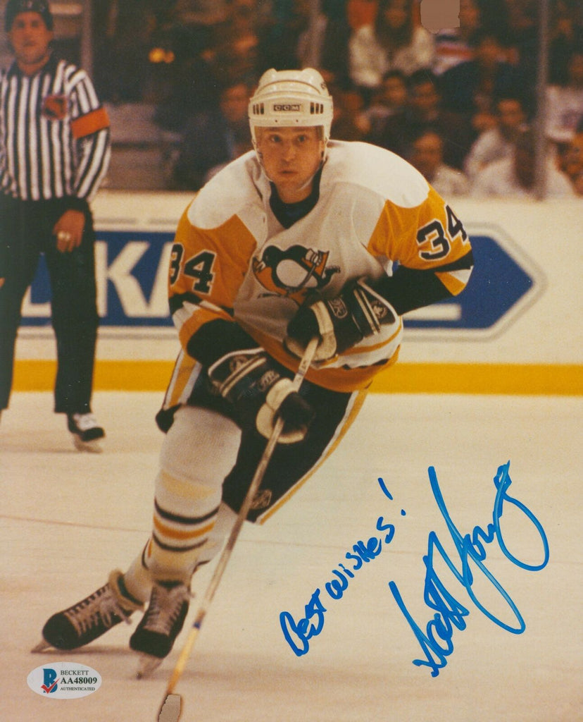 This Autographed 8x10 Photo with the inscription of "Best Wishes!" has been Personally Signed by Scott Young of the Pittsburgh Peguins. This item is 100% Authentic to include a Certificate of Authenticity (COA) / hologram by Beckett Authentication Services. The authenticity can be verified on Beckett Authentication Services website. See photo for condition of the signature.
