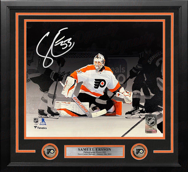 Samuel Ersson First Shutout Philadelphia Flyers Autographed 11" x 14" Framed Blackout Hockey Photo Signed picture of Flyers star goalie Samuel Ersson - authenticated by Dynasty Sports at public autograph event This photo has been signed by Flyers star goalie Samuel Ersson. All autographed memorabilia comes with a certificate of authenticity and matching hologram.Hand-signed by Philadelphia Flyers star goalie Samuel ErssonSignature is bold and clear on the photoAuthenticated by Dynasty Sports from public autograph event on October 27, 2023 - guaranteed to pass JSA or PSA/DNA authenticationFraming is professional qualityFramed 11" x 14" measures 18" x 22"