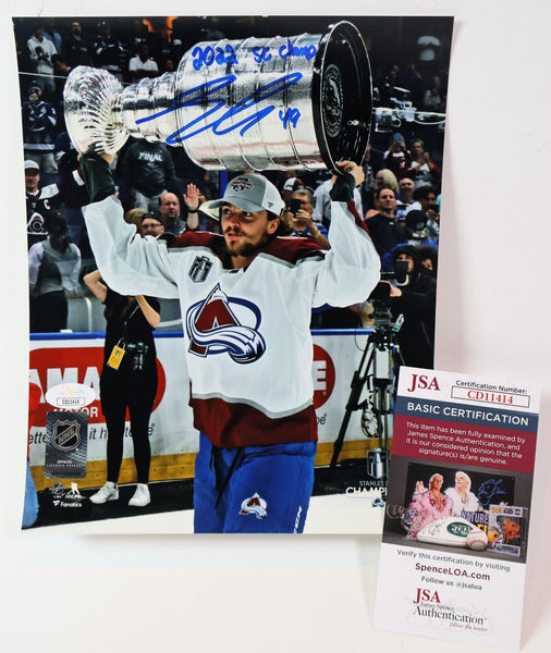 Capture a piece of hockey history with this Samuel Girard autographed 8x10 photo, commemorating his role as a 2022 Stanley Cup Champion with the Colorado Avalanche. Authenticated by James Spence Authentication (JSA) and featuring the player's signature, this original collectible is a must-have for fans and collectors alike. The photo, signed by Sam Girard himself, is a genuine article that comes with a JSA Certificate of Authenticity, ensuring the signature's legitimacy. This exclusive piece celebrates the sport, the team, and the talent of one of hockey's rising stars. Add it to your collection and own a snapshot of Avalanche triumph.