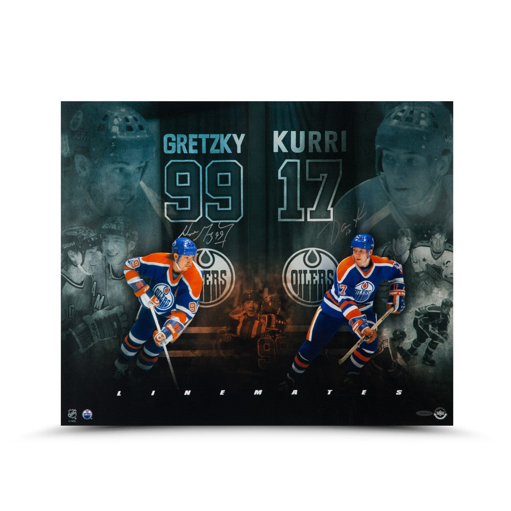 Wayne Gretzky assisted on 364 of Jari Kurri's goals throughout his career while Kurri gave the assist on 196 of Gretzky's. The pair was practically unstoppable in 2-on-1 situations. Kurri came from Finland to play in the NHL, and during the 1980-81 season he was one of six Finnish-born players in the league. Kurri currently holds the third spot in the record books for most playoff goals with 106 behind Gretzky (122) and Mark Messier (109). Together, Gretzky and Kurri won the Stanley Cup four times in a span of five years. This 20" x 24" designed collage celebrates the collaboration of Kurri and Gretzky with different images of them playing together on the Oilers and in NHL All-Star games. Gretzky and Kurri both inked their signatures in silver paint pen under the supervision of a UDA representative using our Five-Step Authentication Process.