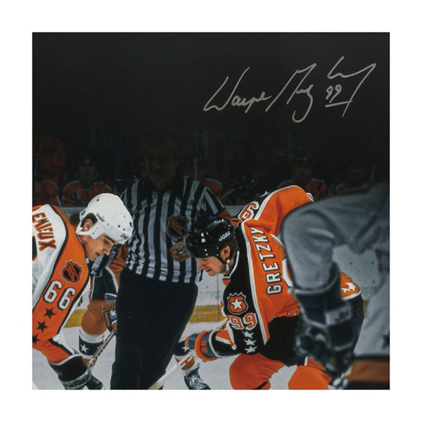 Wayne Gretzky retired as the all-time leader in goals, assists and points as well as holding numerous other records. Gretzky played in 18 All-Star games and currently holds the record for most All-Star game points in a career with 25. He was also the fifth-youngest player to ever appear in an All-Star Game at the age of 19 years and 10 days. Mario Lemieux and Gretzky are tied at three with the most All-Star Game MVP awards. On 1/18/97 in San Jose, Gretzky played alongside Lemieux for the first time in an NHL All-Star Game and recorded an assist on a Lemieux goal. Currently Gretzky either holds or shares six All-Star Game records. This All Star Faceoff is a 20" x 24" image that shows Gretzky and Lemieux preparing for the puck to be dropped. Wayne has signed this image in silver paint pen. Gretzky's signature was witnessed under UDA's Five Step Authentication Process.