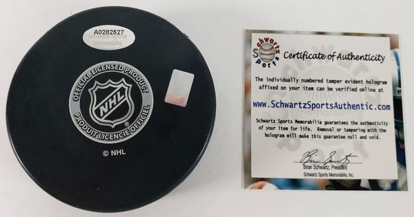 This autographed hockey puck has been personally hand-signed by Denis Savard ("93 Cup" inscription) of the Montreal Canadiens.This autograph is certified by Schwartz Sports. It comes with the numbered hologram and Certificate of Authenticity.