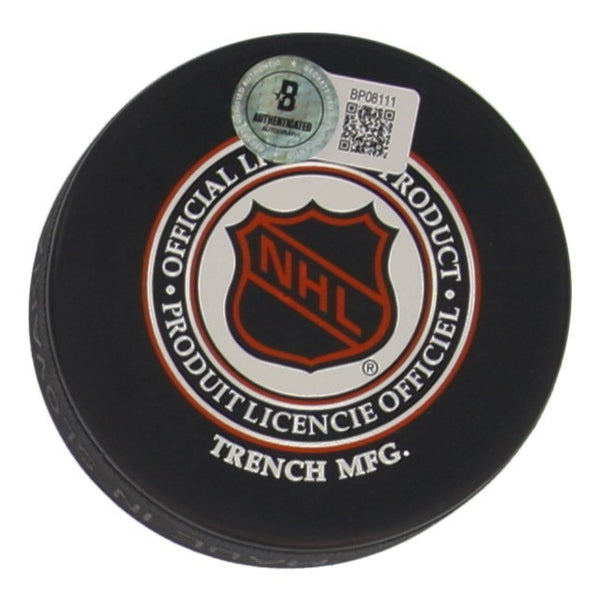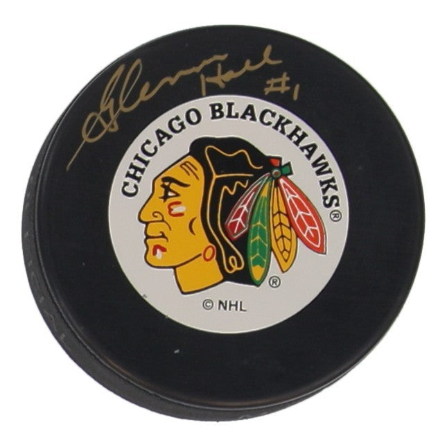Chicago Blackhawks logo hockey puck. Hand-signed and inscribed in gold paint pen by Glenn Hall (Blackhawks, HOF). The autograph includes an official Beckett Authentication Services serially numbered hologram and QR Code card for authenticity purposes. Authentication: Beckett Hologram with QR Code card