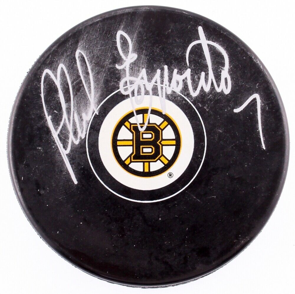 Boston Bruins logo hockey puck has been hand-signed in silver paint pen by Phil Esposito (Chicago Blackhawks, Boston Bruins, New York Rangers, HOF).The lot / autograph(s) includes an official MAB Celebrity Services hologram for authenticity purposes.Authentication: MAB Hologram
