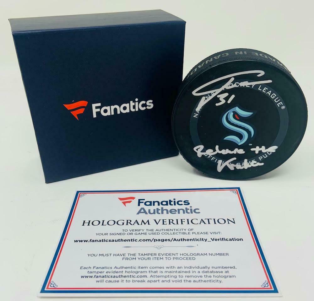 This official seattle kraken game puck has been personally hand-signed by philipp grubauer with the inscription "release the kraken." it is officially licensed by the national hockey league and comes with an individually numbered, tamper-evident hologram from fanatics authentic. to ensure authenticity, the hologram can be reviewed online. this process helps to ensure that the product purchased is authentic and eliminates any possibility of duplication or fraud.