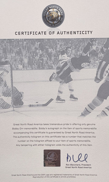 Featured is a Bobby Orr signed Boston Bruins full size Victoriaville hockey stick. This stick was hand signed by Bobby Orr and has been authenticated by Great North Road authentication services. Included with the stick is a GNR hologram and certificate of authenticity. This item would make a great addition to any sports memorabilia collection! SPECIFICATIONS Autographed By: Bobby Orr Team: Boston Bruins Sport: Hockey Authentication: Professional Sports Authenticator (PSA)
