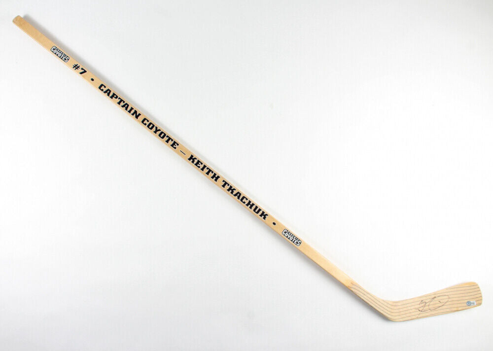 Arizona Coyotes logo full-size hockey stick. Hand-signed by Keith Tkachuk.The lot / autograph(s) includes an official Beckett Authentication Services serially numbered hologram for authenticity purposes.Authentication: Beckett Hologram. Due to the size of this stick, shipping will be $25.