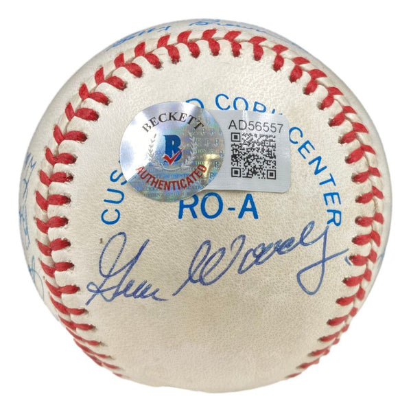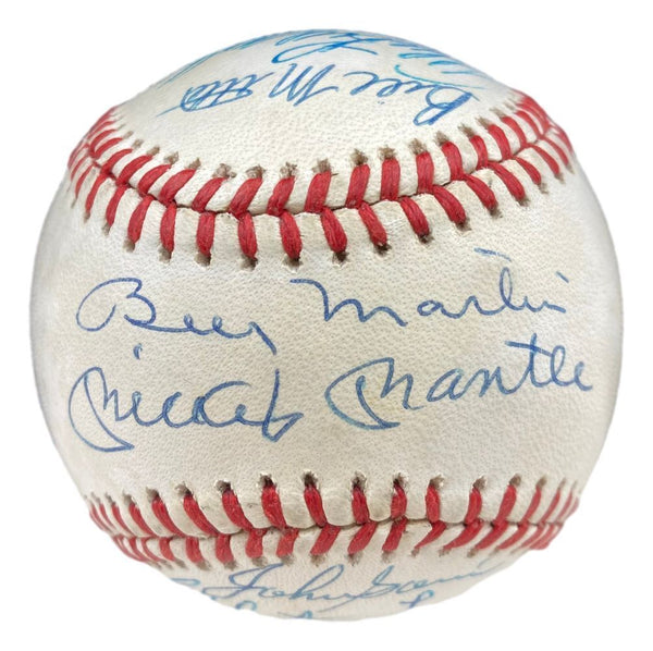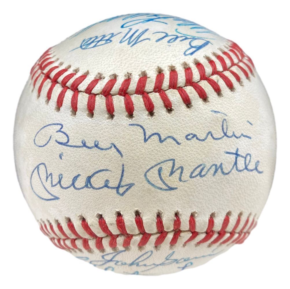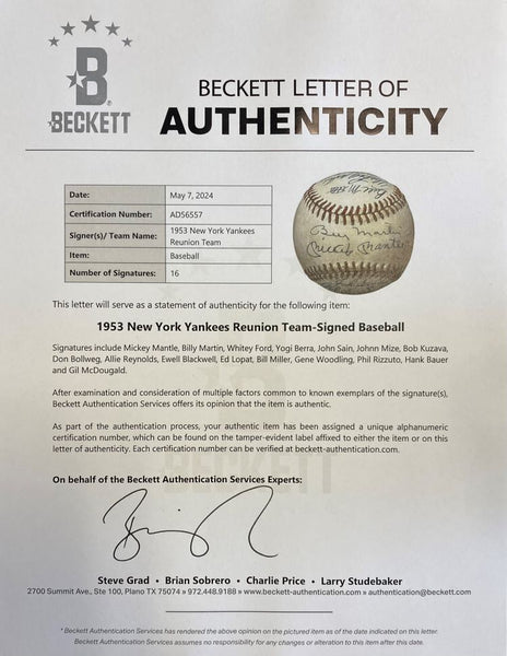 Featured is a 1953 New York Yankees signed official American League baseball. This ball has been hand signed by Mickey Mantle, Billy Martin, Whitey Ford, Yogi Berra, John Sain, Johnny Mize, Bob Kuzava, Don Bollweg, Allie Reynolds, Ewell Blackwell, Ed Lopat, Bill Miller, Gene Woodling, Phil Rizzuto, Hank Bauer and Gil McDougald. This ball comes with the Beckett hologram and letter of authenticity. This ball would make a great addition to any sports memorabilia collection! SPECIFICATIONS Autographed By: Team: New York Yankees Sport: Baseball Authentication: Beckett Grading Services