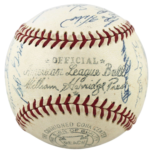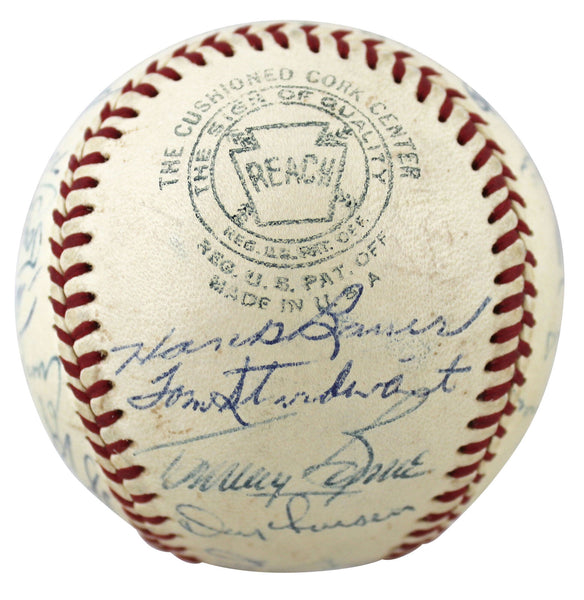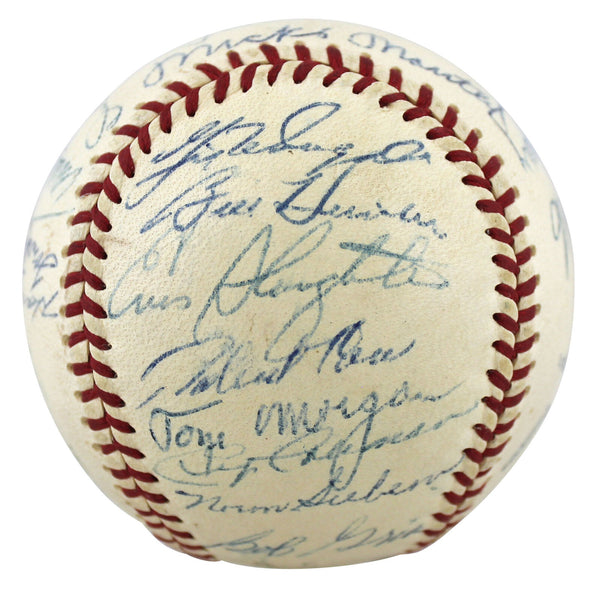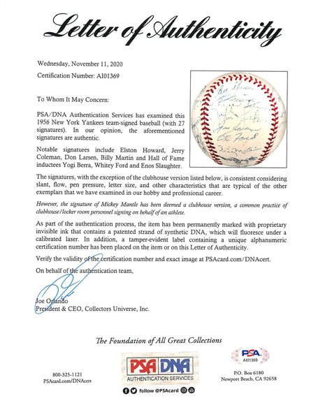 This Autographed William Harridge Oal Baseball has been Personally Signed by Yogi Berra, Whitey Ford, Enos Slaughter, Phil Rizzuto, Don Larsen, Elston Howard, Billy Martin, Bill Skowron, Bob Turley, Norm Siebern, Hank Bauer, Joe Collins, Gil McDougald, Charlie Silvera, Johnny Kucks, Bob Grim, Jerry Coleman, Rip Coleman, Bob Cerv, Tom Morgan, Billy Hunter, George Wilson, Andy Carey, Tommy Byrne, Tom Carroll, and Tom Sturdivant (the Mickey Mantle signature has been deemed a clubhouse version) of the New York Yankees. This item is 100% Authentic and comes with a PSA/DNA Certification Card and a matching numbered Hologram. The authenticity can be verified on Professional Sports Authenticator website.