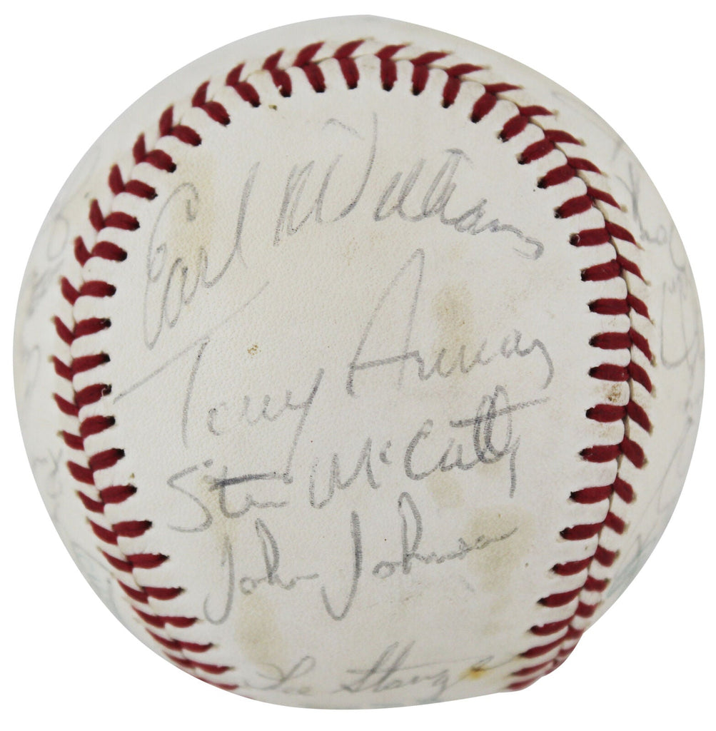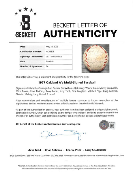 This Autographed Lee Mac Phail Oal Baseball has been Personally Signed by Signatures Include: Lee Strange, Rob Piccolo, Earl Williams, Bob Lacey, Wayne Gross, Manny Sanguillen, Mike Torrez, Steve McCatty, Tony Armas, Jerry Tabb, Rick Langford, Mitchell Page, Craig Mitchell, Sheldon Mallory, Larry Lintz & 9 more! of the Oakland Athletics. This item is 100% Authentic to include a hologram by Beckett Authentication Services. This item will come with an affixed Beckett Authentication Services (BAS) authentication sticker, which includes a scannable QR code to verify authenticity. Please note that Beckett no longer provides serial-numbered COA cards, and the attached BAS sticker will serve as the complete authentication for this item. The authenticity can be verified on Beckett Authentication Services website.