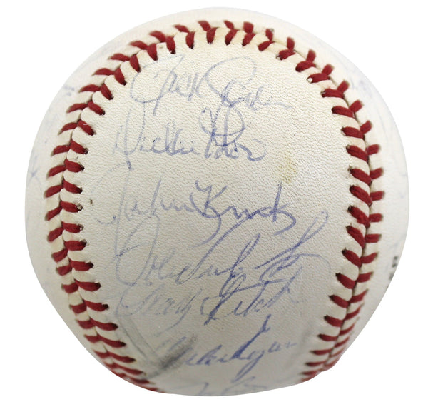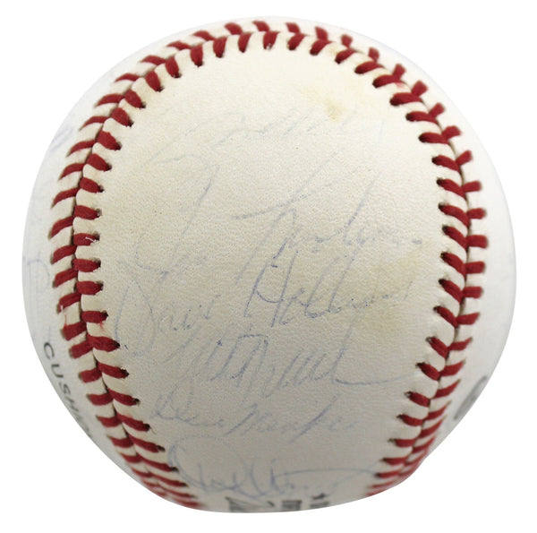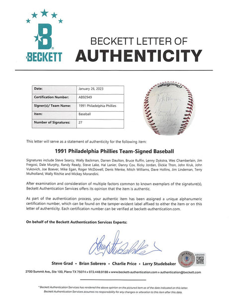This Autographed William White Onl Baseball has been Personally Signed by Steve Searcy, Wally Backman, Darren Daulton, Bruce Ruffin, Lenny Dykstra, Wes Chamberlain, Jim Fregosi, Dale Murphy, Randy Ready, Steve Lake, Hal Lanier, Danny Cox, Ricky Jordan, Dickie Thon, John Kruk, John Vukovich, Joe Boever, Mike Egan, Roger McDowell, Denis Menke, Mitch Williams, Dave Hollins, Jim Lindeman, Terry Mulholland, Wally Ritchie and Mickey Morandini of the Philladelphia Phillies. This item is 100% Authentic to include a Certificate of Authenticity (COA) / hologram by Beckett Authentication Services. The authenticity can be verified on Beckett Authentication Services website.