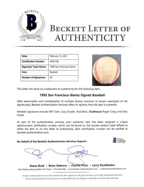 This Autographed William White Onl Baseball has been Personally Signed by Rod Beck, Bud Black, Bryan Hickerson, Dave Righetti, Will Clark, Royce Clayton, Matt Williams, Mark Leonard, Cory Snyder, Ted Wood & 19 more of the San Francisco Giants. This item is 100% Authentic to include a Certificate of Authenticity (COA) / hologram by Beckett Authentication Services. The authenticity can be verified on Beckett Authentication Services website. The Roger Craig and Gary Carter signatures were determined to be Clubhouse signatures.