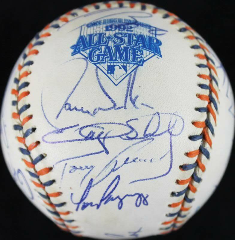 This 1992 NATIONAL LEAGUE ALL STARS (21) SIGNED OML 92 ALL STAR GAME BASEBALL SANDBERG GWYNN PSA/DNA #U03049 has been certified authentic. Notable signature include Ryne Sandberg, Tony Gwynn, Ozzie Smith, Bobby Cox, Tom Glavine, Lee Smith, John Smoltz, David Cone, Dennis Martinez, Craig Biggio, Larry Walker, Terry Pendleton, Bip Roberts & Gary Sheffield. It will include the PSA/DNA numbered hologram and matching Certificate of Authenticity.