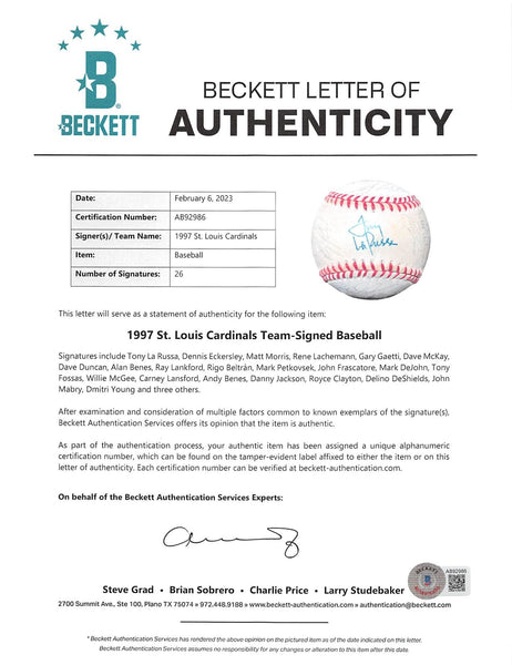 This Autographed Leonard Coleman Onl Baseball has been Personally Signed by Tony La Russa, Dennis Eckersley, Matt Morris, Rene Lachemann, Gary Gaetti, Dave McKay, Dave Duncan, Alan Benes, Ray Lankford, Rigo Beltran, Mark Petkovsek, John Frascatore, Mark DeJohn, Tony Fossas, Willie McGee, Carney Lansford, Andy Benes, Danny Jackson, Royce Clayton, Delino DeShields, John Mabry, Dmitri Young and three others of the St. Louis Cardinals. This item is 100% Authentic to include a Certificate of Authenticity (COA) / hologram by Beckett Authentication Services. The authenticity can be verified on Beckett Authentication Services website.