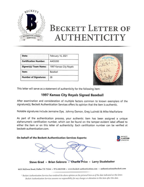 This Autographed Gene Budig Oal Baseball has been Personally Signed by Greg Luzinski, Tim Belcher, Chris Haney, Randy Veres, Mike MacFarlane, Scott Cooper, David Howard, Craig Paquette, Johnny Damon, Jermaine Dye, Tom Goodwin, Bip Roberts, Chili Davis & 15 more of the Kansas City Royals. This item is 100% Authentic to include a Certificate of Authenticity (COA) / hologram by Beckett Authentication Services. The authenticity can be verified on Beckett Authentication Services website.