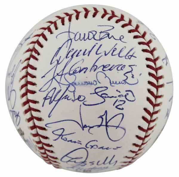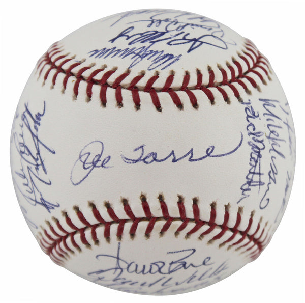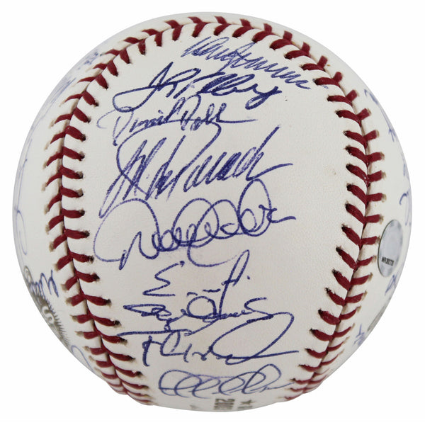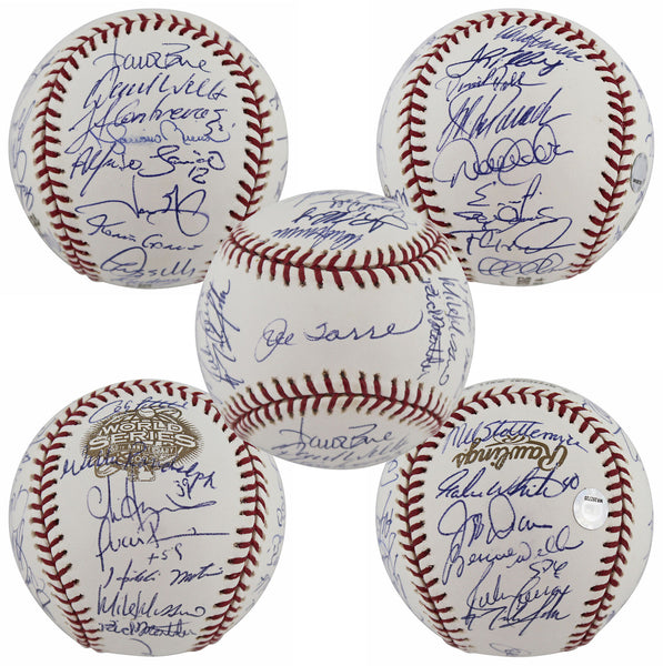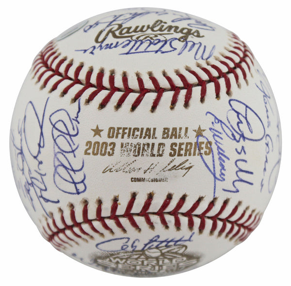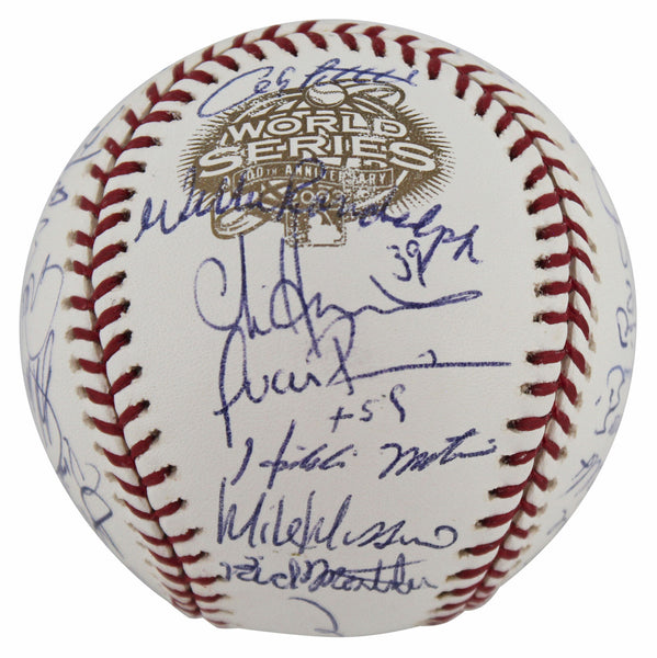 This Autographed 2003 World Series Logo Oml Baseball has been Personally Signed by Aaron Boone, Alfonso Soriano, Andy Pettitte, Bernie Williams, Chris Hammond, David Dellucci, David Wells, Derek Jeter, Enrique Wilson, Felix Heredia, Gabe White, Hideki Matsui, Jason Giambi, Jeff Dodgers-Weaver, Jeff Nelson, Joe Torre, John Flaherty, Jorge Posada, Jose Contreras, Juan Rivera, Karim Garcia, Mariano Rivera, Mike Mussina, Nick Johnson, Roger Clemens, Ruben Sierra of the New York Yankees. This item is 100% Authentic to include a Certificate of Authenticity (COA) / hologram by Steiner Sports.