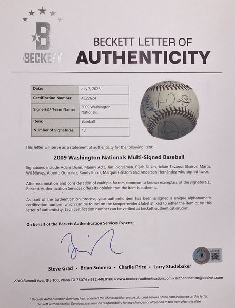 Featured is a 2009 Washington Nationals team signed official MLB baseball. This ball has been hand signed by Adam Dunn, Manny Acta, Jim Riggleman, Elijah Dukes, Julian Tavarez, Shairon Martis, Wil Nieves, Alberto Gonzalez, Randy Knorr, Marquis Grissom, and Anderson Hernandez (twice) and comes with the Beckett hologram and letter of authenticity. This ball would make a great addition to any sports memorabilia collection!. SPECIFICATIONS Autographed By: Team: Washington Nationals Sport: Baseball Authentication: Beckett Grading Services