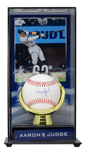 Featured is an Aaron Judge signed New York Yankees MLB baseball, with an acrylic photo display case. This baseball was hand signed by Aaron Judge and has been authenticated by Fanatics and MLB authentication services. Included with the baseball is a Fanatics and MLB hologram and Fanatics certificate of authentication. This baseball would make a great addition to any sports memorabilia collection. SPECIFICATIONS Autographed By: Aaron Judge Team: New York Yankees Sport: Baseball Authentication: Fanatics Authentic