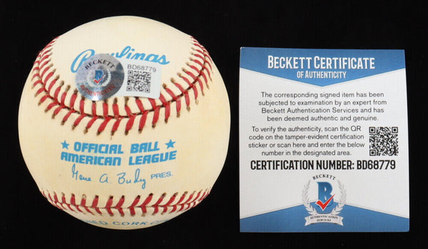 Rawlings Official Major League Baseball. Hand-signed and inscribed in blue ink pen by Al Kaline (Tigers, HOF). Al passed away on April 6, 2020 The autograph includes an official Beckett Authentication Service (BAS) hologram and matching COA for authenticity purposes. Authentication: Beckett COA
