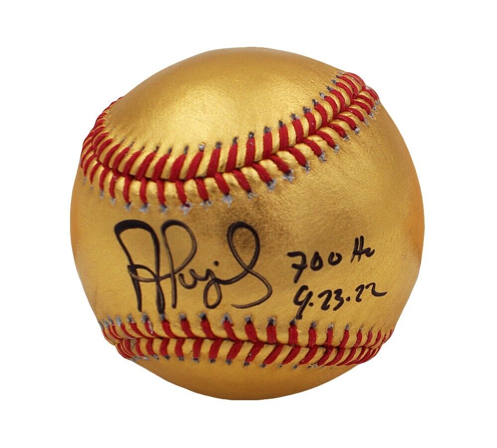 A St. Louis Cardinals Rawlings Official Major League Gold MLB Baseball hand signed by Albert Pujols. The item and signature are in excellent condition. In addition to signing his name Albert also inscribed "700 HR 9-23-22" on the item. Albert is a 11x All Star, 2x World Series Champion, 2x Gold Glove Award Winner & 6x Silver Slugger Award Winner. AUTHENTICATION: The item is accompanied by a Beckett Serial Numbered and Databased Hologram