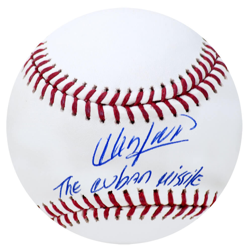 Aroldis Chapman signed Rawlings official MLB baseball with 'Cuban Missile' inscription. Item comes with a Schwartz Sports Memorabilia tamper-proof numbered hologram and Certificate of Authenticity which can be verified online.