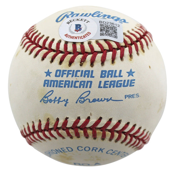 This Autographed Limited Edition #187/200 Thumbprint Bobby Brown Oal Baseball has been Personally Signed by Rollie Fingers of the Oakland Athletics. This item is 100% Authentic to include a Certificate of Authenticity (COA) / hologram by Beckett Authentication Services. The authenticity can be verified on Beckett Authentication Services website. Please refer to photos for condition prior to purchase.