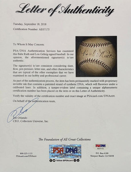 Featured is a Babe Ruth and Lou Gehrig dual signed Spalding baseball. This ball has been hand by Ruth and Gehrig signed comes with the PSA/DNA hologram and letter of authenticity. This ball would make a great addition to any sports memorabilia collection! SPECIFICATIONS Autographed By: Babe Ruth Team: Sport: Baseball Authentication: PSA/DNA Authentication Services