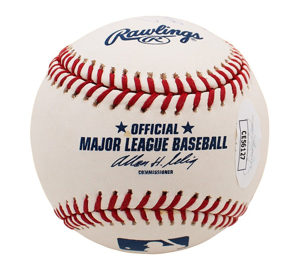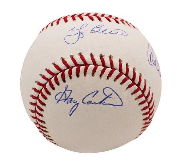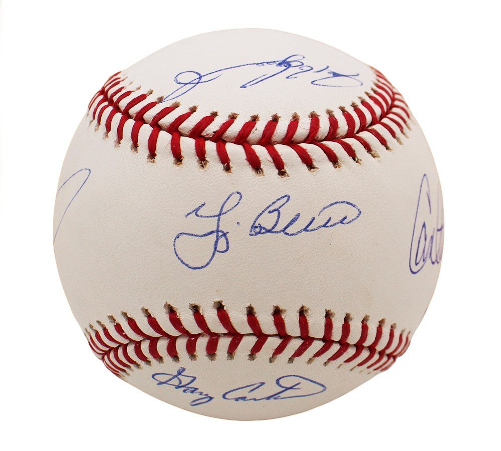 A New York Yankees Rawlings Official Major League White MLB Baseball hand signed by Yogi Berra, Mike Piazza, Gary Carter, Carlton Fisk and Ivan Rodriguez. The item and signatures are in excellent condition. AUTHENTICATION: The item is accompanied by a JSA Certificate of Authenticity - JSA Serial Numbered & Databased Hologram