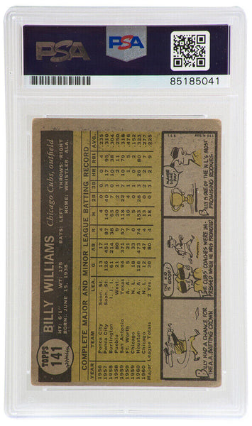 Billy Williams signed Chicago Cubs 1961 Topps baseball rookie card #141. The card has been authenticated and encapsulated by PSA/DNA and the autograph has been given a GEM Mint 10 auto grade. The authentication number can be verified online. Only the autograph has been graded a 10 by PSA, the card itself is ungraded.