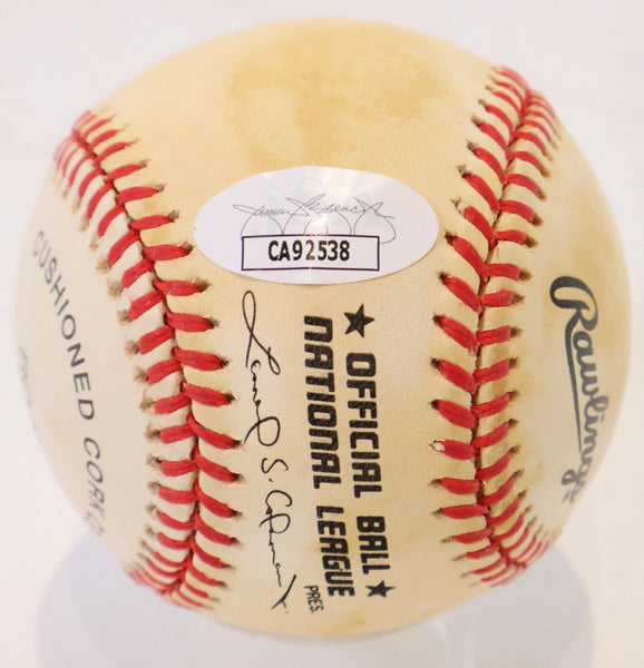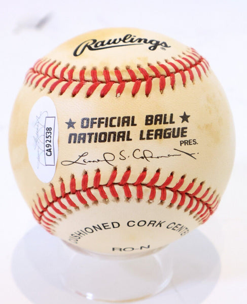 A Legend's Signature - Bob Gibson Hall of Fame Baseball This authentic Bob Gibson autographed Official National League Baseball is a treasured piece of baseball history from one of the most dominant and intimidating pitchers to ever take the mound. Gibson's signature represents an era of baseball excellence and fierce competitive spirit that defined the St. Louis Cardinals dynasty. About Bob Gibson Baseball Hall of Fame Inductee (1981) - First-ballot Hall of Famer with one of the most impressive careers in baseball history 2-Time Cy Young Award Winner (1968, 1970) - Recognized as the best pitcher in the National League 1968 NL MVP - One of the greatest single-season performances ever, posting a microscopic 1.12 ERA 2-Time World Series MVP (1964, 1967) - Dominated on baseball's biggest stage 9-Time All-Star - Consistently among baseball's elite throughout his career 251 Career Wins - All with the St. Louis Cardinals 3,117 Career Strikeouts - One of the most feared power pitchers of his generation Cardinals Legend - His #45 jersey is retired by the organization The 1968 Season - The Year of the Pitcher Gibson's 1968 season was so dominant that Major League Baseball lowered the pitcher's mound the following year. His 1.12 ERA remains one of the most untouchable records in sports history. Authentication & Quality This baseball comes with a JSA (James Spence Authentication) Certificate of Authenticity, guaranteeing the signature's legitimacy. JSA is one of the most respected authentication services in the sports memorabilia industry. Signed on an Official National League Baseball, the same quality used during Gibson's playing days. Perfect For St. Louis Cardinals collectors and fans Hall of Fame memorabilia enthusiasts Investors seeking premium sports collectibles Fans of baseball's golden era Unique gift for serious baseball historians Own a piece of baseball immortality from one of the game's most fierce competitors and dominant pitchers.
