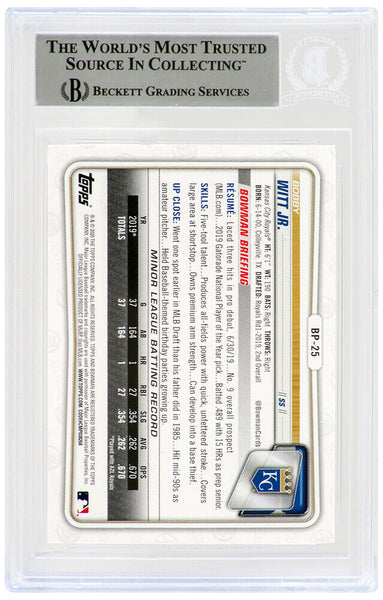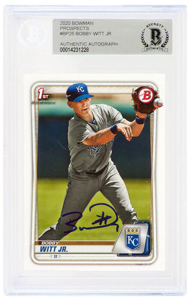 Bobby Witt Jr. signed Kansas City Royals 2020 1st Bowman rookie baseball trading card #BP-25. The card has been authenticated and encapsulated by Beckett Authentic and the authentication number can be verified online.