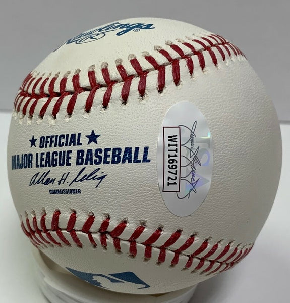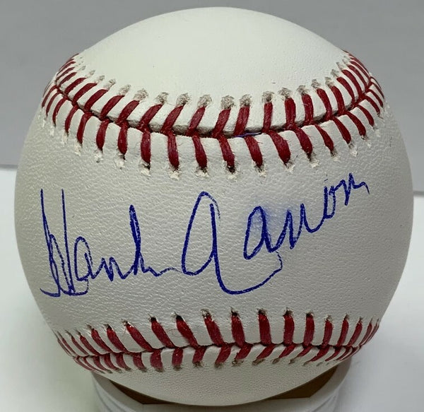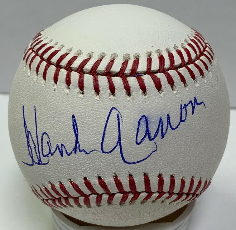 An official Major League Baseball hand signed by MILWAUKEE/ATLANTA BRAVES HALL OF FAMER HANK AARON. The signature is in blue ink pen. This baseball was signed at a private signing with us. This would make a great addition to any BREWERS, BRAVES or AARON collection! This item is guaranteed to be 100% authentic and will include a store COA from JSA authentication.