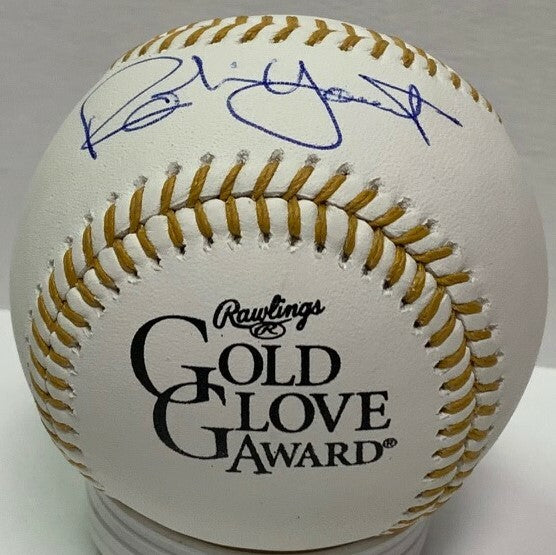 An official Major League GOLD GLOVE Logo Baseball hand signed by Milwaukee Brewers Hall of Famer ROBIN YOUNT. The signature is in blue ink pen. This baseball was signed at a private signing with us. This would make a great addition to any Yount or Brewers collection! This item is guaranteed to be 100% authentic and will include a COA from JSA Authentication.