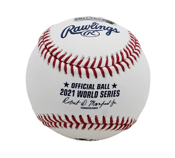 An Atlanta Braves Rawlings 2021 World Series MLB Baseball hand signed by Brian Snitker. The item and signature are in excellent condition. In addition to signing his name, Brian also inscribed "Pearls to Rings" on the item. Brian is a World Series champion, and a NL Manager of the Year (2018). Brian has been a coached and the Manager of the Brave. AUTHENTICATION: The item is accompanied by a Certificate of Authenticity - Serial Numbered and Databased Hologram - Picture of Brian from the signing