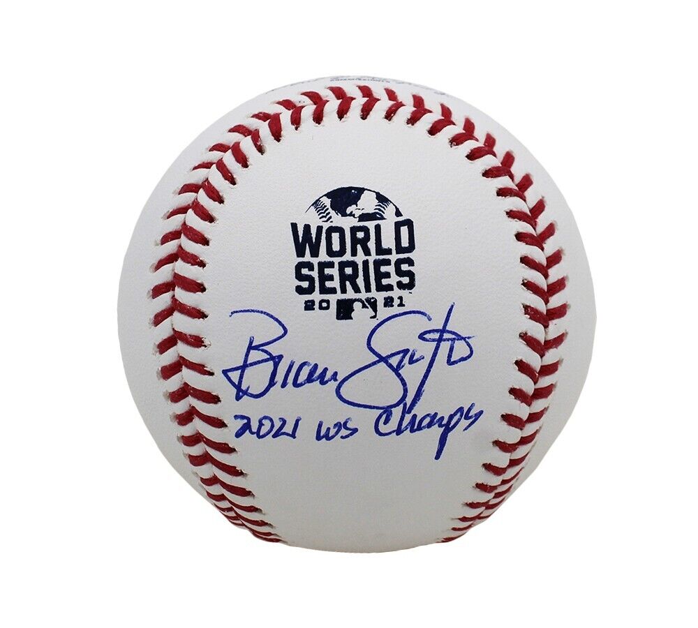 An Atlanta Braves Rawlings 2021 World Series MLB Baseball hand signed by Brian Snitker. The item and signature are in excellent condition. In addition to signing his name, Brian also inscribed "2021 WS Champs" on the item. Brian is a World Series champion, and a NL Manager of the Year (2018). Brian has been a coached and the Manager of the Braves. AUTHENTICATION: The item is accompanied by a Certificate of Authenticity - Brian Snitker Exclusive Serial Numbered and Databased Hologram - Picture of Brian from the signing