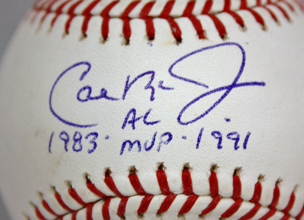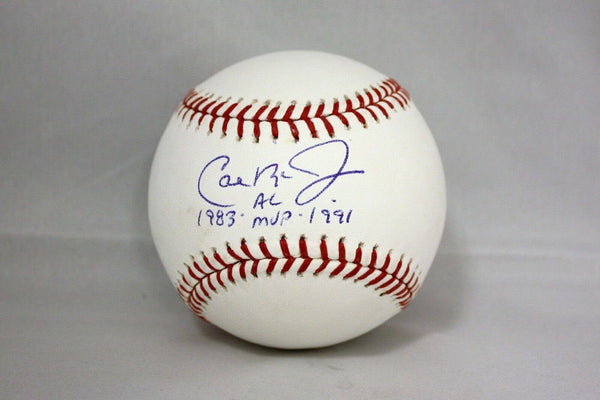 Cal Ripken Jr AL MVP Autographed Rawlings OML Baseball- JSA W Authenticated This is a Cal Ripken Jr hand autographed Rawlings OML Baseball with AL MVP 1983 1991 inscription. This item has a James Spence Authentication, which comes with a JSA numbered sticker and a matching JSA Certificate of Authenticity. You can view this item on the JSA website and it shows when and where the item was signed. It was signed either at a public autograph appearance or a private signing. This is a stock photo of the item. Although you may not receive this exact item, the item you receive is virtually identical, brand new, and in great shape. We appreciate your interest in our items and strive to make all transactions satisfying and professional.