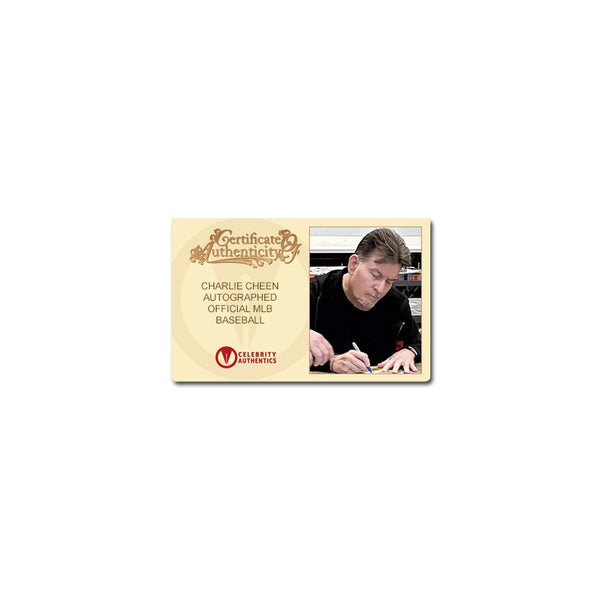 This impressively signed Rawlings Official Major League Baseball been personally hand-signed by entertainment legend Charlie Sheen who added 'WILD THING' during his signing with Celebrity Authentics. Beautifully signed on the sweet spot with inscription! The new owner of the Cleveland Indians, former showgirl Rachel Phelps (Margaret Whitton), has a sweetheart deal to move the team to Miami. But to break the lease with the city of Cleveland, ticket sales have to plummet. So Phelps hires the most incompetent players available, including near-blind pitcher Rick Vaughn (Charlie Sheen) and injury-prone catcher Jake Taylor (Tom Berenger). But her villainous tactics accidentally foster a can-do team spirit, turning the Indians into potential winners. Ships affixed with Celebrity Authentics serial-numbered and tamper evident Authentication Hologram and includes Celebrity Authentics Certificate of Authenticity featuring picture of Charlie signing baseball. Please note: With multiples signed by the actor, a sample photo is used from stock to represent what you will receive. Exact autograph size and placement may vary.