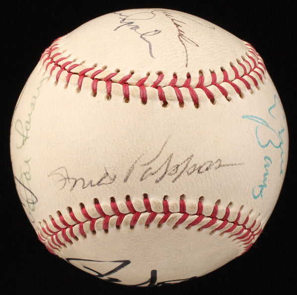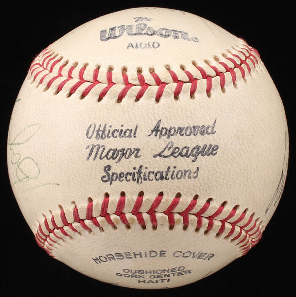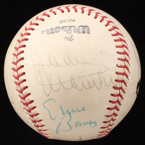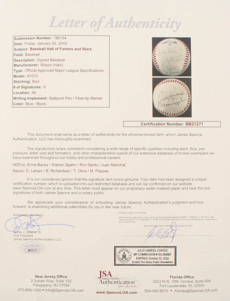 Rawlings Official American League baseball has been hand-signed in black ink and felt-tip pen by Baseball Hall of Famers and stars including Ernie Banks (died 2015), Warren Spahn (died 2003), Ron Santo (died 2010), Juan Marichal, Don Larson (died 2020), Bobby Richardson, Tony Oliva, Milt Pappas (died 2016). The lot / autograph(s) includes an official James Spence Authentication (JSA) hologram and matching LOA for authenticity purposes.Authentication: JSA LOA Check out all the items in our Friendly Confines Collectibles store, Thanks for looking.