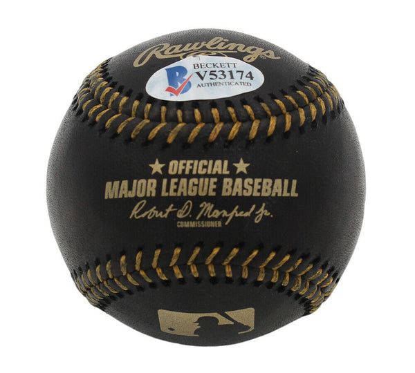 An Atlanta Braves Rawlings Official Major League Black MLB Baseball hand signed by Cristian Pache. The item and signature are in excellent condition. In addition to signing his name, Cristian also inscribed "#1 Prospect" on the item. Cristian is a baseball outfielder for the Braves. He was called up to the major league level in 2020. His first major league hit was a single. AUTHENTICATION: The item features a Beckett Certificate of Authenticity - Beckett Serial Numbered and Databased Hologram