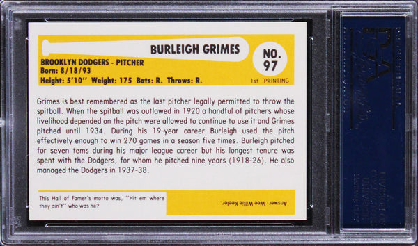 This Autographed 1980 Baseball Immortals #97 Card has been Personally Signed by Burleigh Grimes of the Brooklyn Dodgers. This item is 100% Authentic, it comes slabbed and authenticated by PSA/DNA. The authenticity can be verified on Professional Sports Authenticator website.
