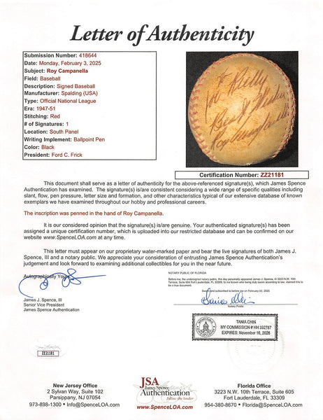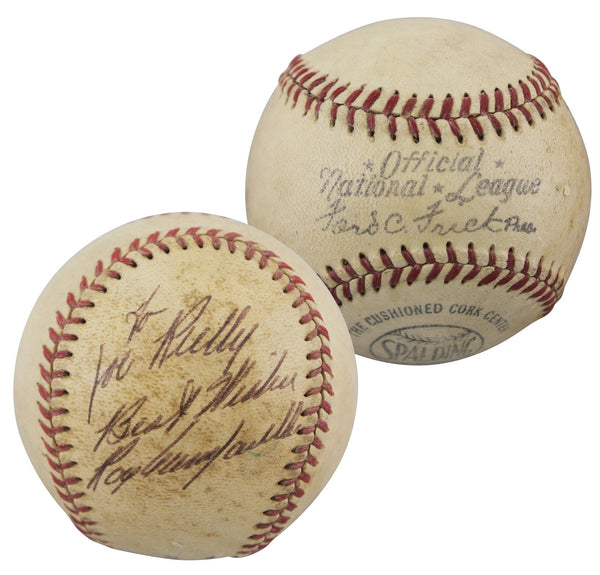 This Autographed Giles Onl Baseball with the inscription of "To Joe Rielly Best Wishes" has been Personally Signed by Roy Campanella of the Brooklyn Dodgers. This item is 100% Authentic to include a Certificate of Authenticity (COA) / hologram by JSA. The authenticity can be verified on JSA website.