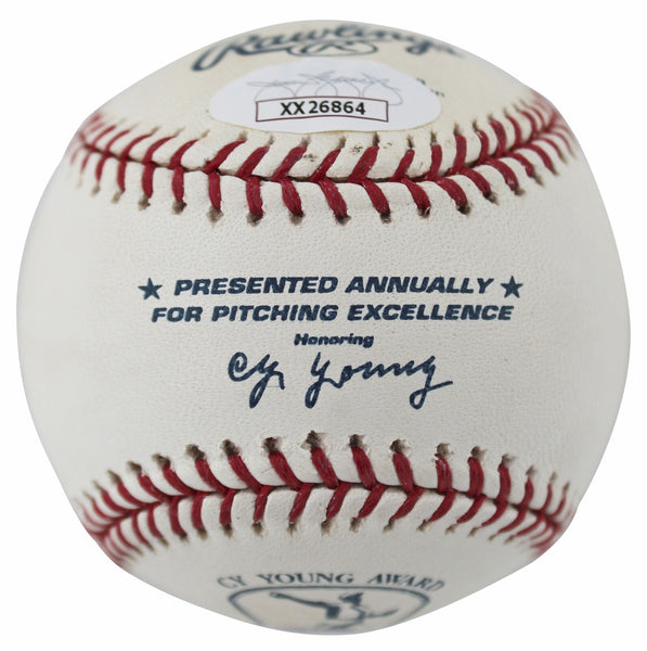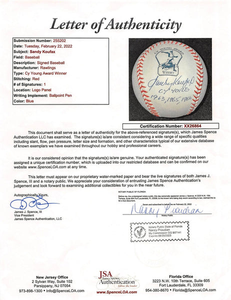 This Autographed Cy Young Award Winner Logo Oml Baseball with the inscription of "Cy Young 1963, 1965, 1966" has been Personally Signed by Sandy Koufax of the Los Angeles Dodgers. This item is 100% Authentic to include a Certificate of Authenticity (COA) / hologram by JSA. The authenticity can be verified on JSA website.
