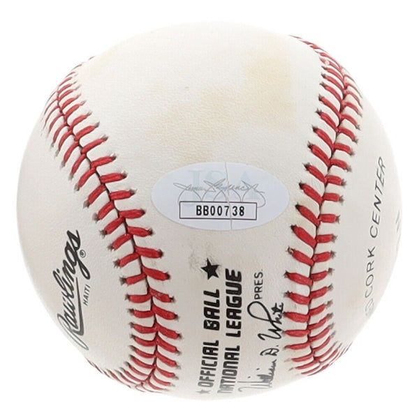 Rawlings Official National League baseball. Hand-signed by Don Drysdale (Died 1993, Los Angeles Dodgers, HOF).The autograph(s) includes an official James Spence Authentication (JSA) hologram for authenticity purposes.Authentication: JSA HologramDon Passed Away on July 2, 1993, he worked the television broadcast for the game between the Dodgers and the Montreal Expos at Olympic Stadium. After the game, he returned to his room at the hotel the team was staying at, Montreal Sheraton. As the team left for the stadium the next morning, Drysdale was not with them. Several broadcast team members were sent back to the hotel once the team realized Drysdale had not arrived at the stadium, and when hotel personnel went up to Drysdale's room, they discovered his body lying face down on the floor. The cause of death was ruled to be a heart attack, and the coroner's report determined that Drysdale had been dead for at least eighteen hours by the time he was found.