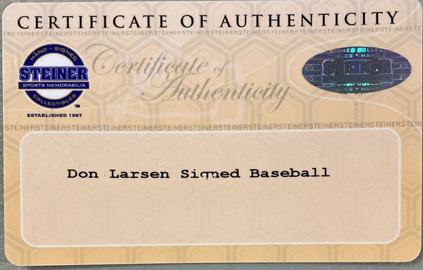 Featured is a Don Larsen signed Rawlings official MLB baseball. This baseball has been hand signed by Larsen and comes with the Steiner Sports hologram and certificate of authenticity. This ball would make a great addition to any sports memorabilia collection! SPECIFICATIONS Autographed By: Don Larsen Team: New York Yankees Sport: Baseball Authentication: Steiner Sports