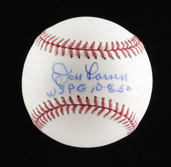 Rawlings Official Major League Baseball. Hand-signed and inscribed in blue ink pen by Don Larsen. The autograph includes an official James Spence Authentication (JSA) hologram and matching COA for authenticity purposes. Larsen pitched the 6th perfect game in MLB history, doing so in Game 5 of the 1956 World Series It is the only no-hitter / perfect game in World Series history and is one of only two no-hitters in MLB postseason history.Authentication: JSA COA
