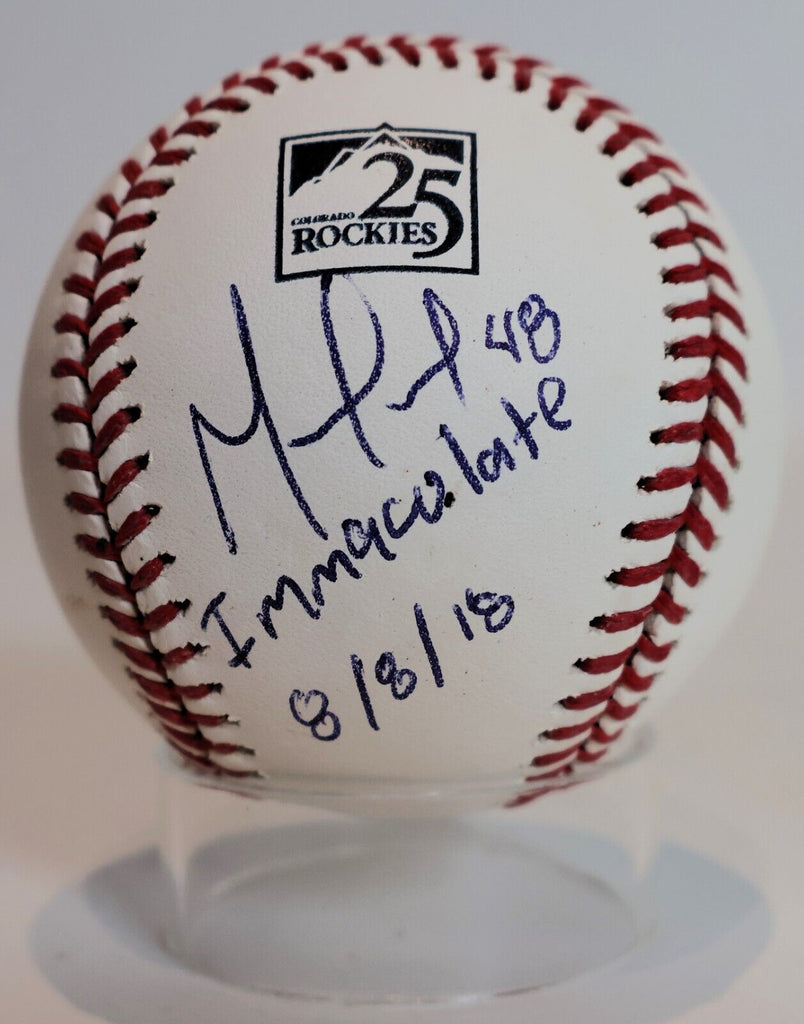 The product is an original MLB-authenticated baseball signed by German Marquez of the Colorado Rockies. The baseball is inscribed with the phrase "Immaculate 8/8/18".