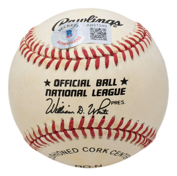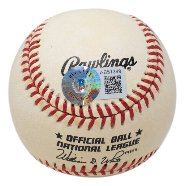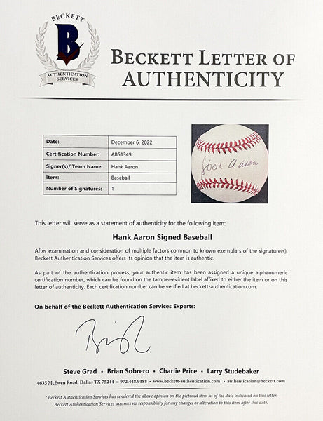 Featured is a Hank Aaron Milwaukee Braves signed official National league baseball. This baseball was hand signed by Hank Aaron and authenticated by Beckett authentication services. Included with the baseball is an Beckett hologram and letter of authenticity. This item would make a great addition to any sports memorabilia collection!. SPECIFICATIONS Autographed By: Hank Aaron Team: Milwaukee Braves Sport: Baseball Authentication: Beckett Grading Services