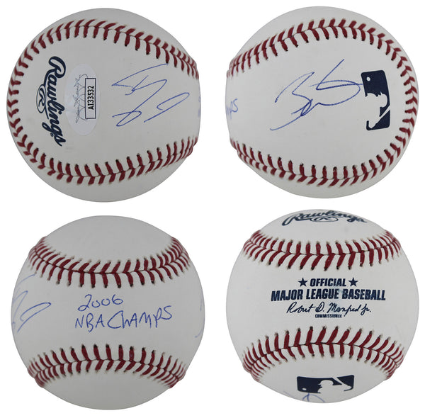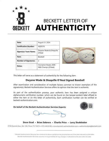 This Autographed Oml Baseball with the inscription of "2006 NBA Champs (O'Neal)" has been Personally Signed by Dwyane Wade & Shaquille O'Neal of the Miami Heat . This item is 100% Authentic to include a Certificate of Authenticity (COA) / hologram by Beckett Authentication Services. The authenticity can be verified on Beckett Authentication Services website.