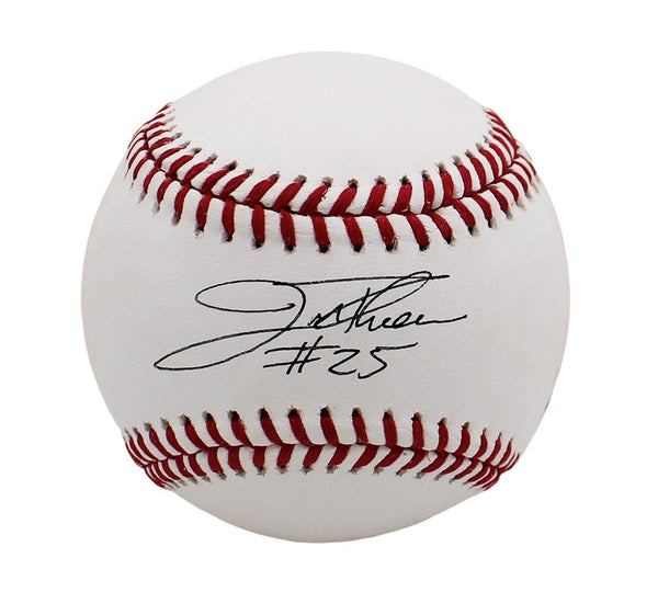 A Cleveland Indians Rawlings Official Major League MLB Baseball hand signed by Jim Thorne. The item and signature are in excellent condition. Jim Thorne is a former professional baseball player. He was a powerful left-handed hitter known for his 612 career home runs inducted into the Hall of Fame in 2018. AUTHENTICATION: The item is accompanied by a JSA Certificate of Authenticity - JSA Serial Numbered and Databased Hologram