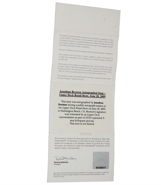 Jonathan Broxton Autographed Official MLB Baseball - Los Angeles Dodgers - UDA Certificate Made in the USA Personally Autographed by Jonathan Broxton Includes tamper-evident hologram to ensure authenticity Officially licensed This product is guaranteed authentic and includes a Upper Deck Certificate of Authenticity and an accompanying tamper-evident UDA Hologram.